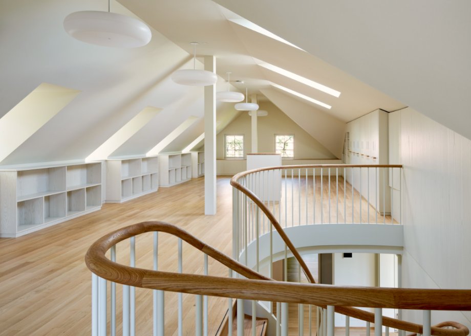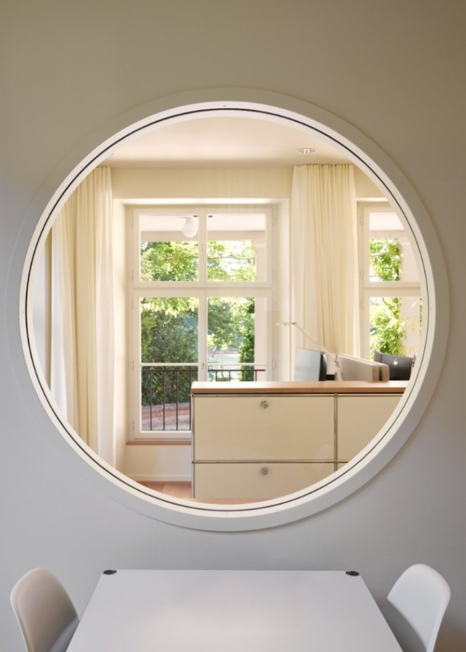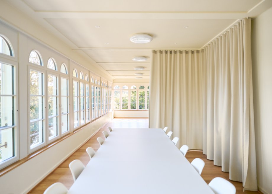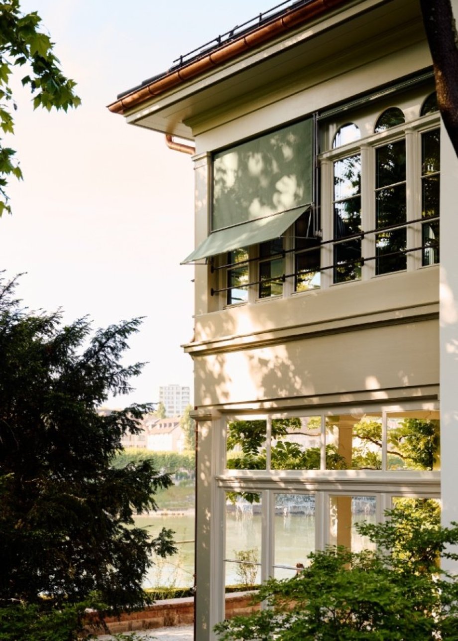 Ziel war es, funktionale und flexible Arbeitsräume zu schaffen und zugleich die architektonische Identität zu bewahren. Die neue Treppenanlage und die überarbeiteten Innentüren zeigen exemplarisch das Zusammenspiel historischer Elemente mit heutigen Anforderungen. Der ausgebaute Dachstock mit Lukarnen und Giebelfenstern bietet helle Arbeitsplätze und eine effiziente Archivablage, eine neue zentrale Treppe verbindet alle Geschosse und in der verglasten Veranda entstand ein Besprechungsbereich mit Blick auf den Rhein.